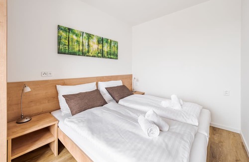 Our apartment is 5 km from Frymburk. The house is in the middle of a small holiday village. The holiday resort is located in a quiet bay with a direct view of Lake Lipno. The apartment is on the 1st floor of an apartment building, approx. 50 meters from the lake. In the summer months, guests have access to a small bistro on the lakeshore as well as bicycle and boat rentals. This 70 m² apartment has 2 bedrooms, 2 balconies (one with a view of the lake), a living room with open kitchen and pellet stove, refrigerator (including freezer compartment), dishwasher, microwave, Nespresso machine, flat-screen TV, seating in the living area and 1 bathroom with shower, toilet and washing machine. Each bedroom has a double bed. In one of the bedrooms you can push the beds apart so you can sleep separately. Towels and bed linen are provided in the apartment. Free WiFi and free private parking are available. The apartment can be rented for 2 to 4 people. Depending on occupancy, 1 or 2 bedrooms are available.