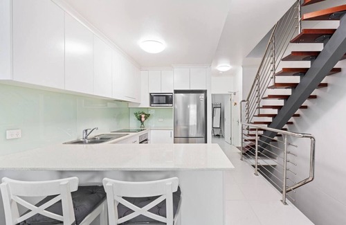 Ascending from the garage, you’ll arrive on the lower level. The open plan living and dining area is fitted with air-conditioning and comes with a four-person table for meals at home. This extends to the kitchen, fully equipped with a breakfast bar and sleek, stainless-steel appliances. Relax on the cosy sofa fronting a wide-screen TV as you slide the doors open towards the courtyard creating a beautiful transition between indoors and out. Dine alfresco soaking up the fresh sea air, while the fenced backyard allows pets to spread out under the sun.