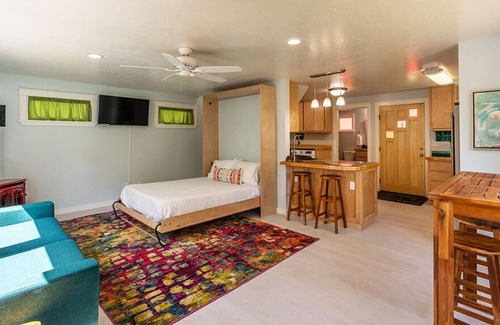 Step inside to a wonderland of imagination that feels just like the delightful children’s storybook “The Little House” by Virginia Lee Burton. Situated at a bend along a popular rural neighborhood road sits The Little Red House built in 1942. In 2021 it was lovingly & creatively renovated into a magical 800 sq. ft. retreat. This house has a fully fenced backyard with ample room for your dog to enjoy the outdoors. Guests will love the breakfast bar with custom crafted resin countertops that preserve beach combing treasures like shells, seaweed & stones. Brand new stainless steel appliances including a gas stove make cooking a delight. The creative use of this 800 sq. ft. cottage that sits on a large parcel of fenced off land next to a creek is a delight. The small but open living room includes a Queen size Murphy bed, high top dining table for 2, sofa, Roku T.V and vintage style gas fireplace. Located just off the kitchen is a full bathroom designed for comfort after a day hiking in the Redwoods with a walk in mosaic tiled shower with an ocean scene of nearby “Camel Rock”, dual shower heads and on demand hot water. Head up a short, narrow steep stairway to a loft filled with natural light and set to a theme of clouds. A Queen bed, small desk, cozy reading nook and tiny deck w/ outdoor seating and views of the farm animal mural on the detached and decommissioned historic garage make this loft complete. This tiny home feels best suited for close friends or a small family who feel comfortable sharing a cozy space. The proximity to nearby Moonstone Beach just ½ mile away more than makes up for its lack of privacy. Onsite parking allows a maximum of 2 cars, no garage parking available.