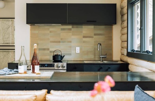 Step inside to discover a sanctuary where vintage Danish, Mexican, and American mid-century furniture grace the light-filled spaces adorned with natural log-wood walls and high ceilings. The attention to detail is evident in every corner, from the cozy sitting room with a wood-burning fireplace to the sleek modern kitchen equipped with top-of-the-line appliances including an induction range and All-Clad cookware.