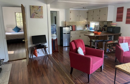 Clean, modern interior, charming cottage/cabin, lovely little fenced yard with shade and lounge seating with incredible views of the Santa Monica mountains, situated on a 4 acre property, walking distance to Topanga State Park entrance, nearest neighbors are horses. Very private, 2 bedrooms, 1 bathroom, and kitchen and living room, barbecue outside. Boogies boards, and beach towels provided as it is a short drive to Topanga State Beach. Internet, bluetooth speaker, cable tv, fully equipped kitchen. This is the place to unwind and take in the views, very secluded and perfect place from which to explore Topanga. Newly refurbished with brand new beds, mattresses, furniture etc. Lots of books, board games, puzzles etc. when our hens are laying well we like to leave our guests some fresh eggs to start their stay.