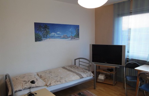 Parking, shopping facilities (Netto, Aldi, Lidl and REWE) and motorway connections are excellent. Rheinpark with excursion restaurant within walking distance.