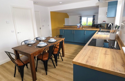 Amenities: Gas central heating with underfloor heating. Electric oven and hob, microwave, fridge, freezer, washing machine, dishwasher, kettle, toaster. Smart TV, WiFi. Fuel and power inc. in rent. Bed linen and towels inc. in rent. Highchair and travel cot available. Off-road parking for 2 cars. Enclosed, shared, front lawn with furniture and children's swing. Non-enclosed, shared, front garden with lawn, patio, and picnic benches. Enclosed, front patio with furniture and barbecue. Enclosed rear garden with patio and gravel. Two well-behaved dogs welcome. Sorry, no smoking. Shop 0.2 miles, pub 0.9 miles, beach 1.6 miles. Note: Although this property is single-storey, there are a few steps down to sitting area and twin-bedroom