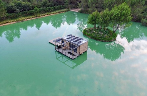 A floating lodge, set in the middle of a pond, surrounded by nature. Here, no roads, no neighbors, just calm, water and the spectacle of koi carp gliding beneath your feet.