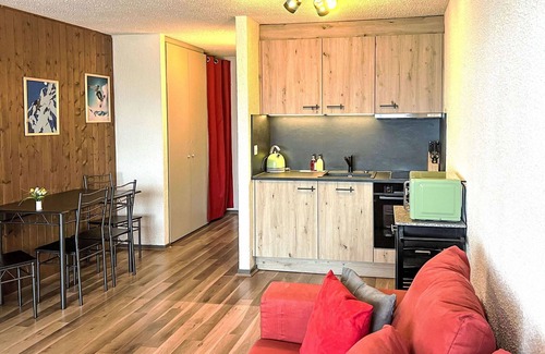 The studio apartment is furnished with practical and comfortable pieces. It includes a small kitchenette outfitted with essential appliances such as a toaster, kettle, electric coffee machine, raclette grill, and a fondue set (cheese). The bathroom contains a bathtub and a toilet. Additionally, the property offers complimentary WiFi internet access and a reserved parking spot within a fenced area for one car.