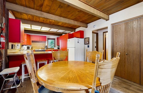 This rustic-style cabin has a circular driveway that's perfect for parking boats or snowmobiles. In the summer, guests can relax out on the large wrap around deck while dinner is cooking on the grill. In the winter, this home's prime location by tow, the lake, and the mountains makes it an even more fun retreat. The family dog is welcome to join you!