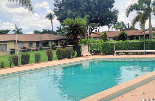 Out the back door is the community heated large lap pool 3 to 8 ft. deep. Showers and restrooms at the pool with lounging chairs and a covered with 5 tables to entertain. This is a lovely area with lush green grass and landscaped with beautiful tropical native plants and trees.