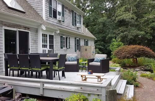 This professionally landscaped 4 bedroom, 2.5 bath home is situated on a 1/2 acre in an extremely quiet cul de sac in the highly desirable North side of 6A in Dennis Village area. Our home has fresh Pottery Barn/cottage style furnishings. Open floor plan kitchen/living area with cathedral ceiling and featuring a 65 inch TV with multiple streaming services over the gas fireplace. Digitally controlled Central Air conditioning to keep you comfortable on the hottest days! Downstairs layout features open floor plan living room/gorgeous chef's kitchen/dining room and sliding glass door out to deck and backyard. First floor laundry with half bath and master bedroom/bath/walk-in closet are also on first floor. Upstairs, you will find 3 additional bedrooms and a full bath with tub. The kids room has two twins with two trundles. The other two bedrooms have queen size beds, one with a large desk and chair. Back yard oasis features cedar outdoor shower, deck equipped with dining table for 8, club chairs, and grill, and plenty of area to play and enjoy the beautiful Cape Cod summer weather. Gorilla swing set to entertain the kids! Home includes usage of lots of kids toys and an adult's bike. Mayflower, Chapin's, Bayview, and Corporation Beaches are all close by, as is a playground, ice cream parlor, doughnut shop, Dennis Playhouse, and Dennis Market. We do recommend that you explore the beaches beyond Dennis as the Cape offers so many different types of beaches that you shouldn't miss out on! We have a Cape Cod guidebook put together with our recommendations on beaches, dining, and other activities not to be missed!