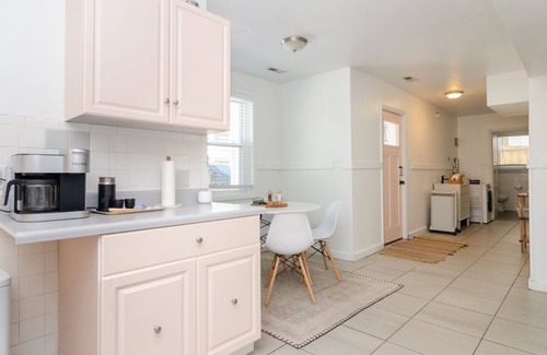 The split bedroom configuration provides privacy and maximizes the space, The primary bedroom is furnished with a queen bed and is located next to the full bathroom. There is a combination washer dryer in the hall for added convenience. Just across from the living room is the second guest room - the bunk bed configuration makes this room great for kids! There is also a queen-size sofa bed located in the living room. As you step into the kitchen, the charm and character of this home truly grips you. Blush color cabinets surround the dining nook. This quaint kitchen provides all the essentials to prepare meals.