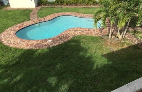 This vacation villa property is 3 quarters of a acre and is located in a private double gated community with 24 hour security. The house is a 4 bedroom which includes a King size bed in the master bedroom with a 50 inch Television, Queen size beds in room number 2 and 3, and a bunk bed (Full/Twin) in the 4th bedroom. The family room has a queen pull out sofa and a single person couch/futon in the back room. Every room in the house is equipped with A/C. The villa has a main floor open terrace with outside dining table for 8 guest. The family room is equipped with a 60 inch LED 4K Television. The back game room is fitted with a 43 inch television with a Xbox One game system (2 controllers) and various games. The villa is equipped with Cable TV ,150 mps Wi-Fi and wireless speaker. Backyard has a 15x30 kidney shaped swimming pool with lighting system and BBQ grill with propane tank. The outside area also boasts a Charcoal/Wood burning BBQ chiminea and wash station. The pool area has a outside bathroom with outdoor shower.