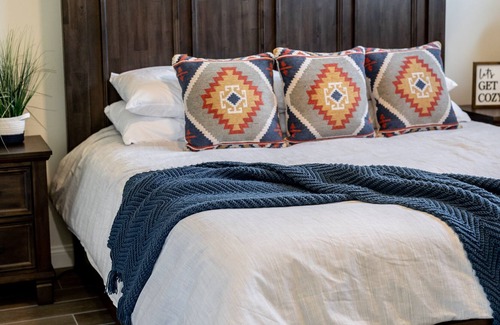 Master Bedroom: The spacious master bedroom, located on the main floor, highlights a plush, new King-sized bed. This room features an ensuite bathroom, a closet area, and a large double door with windows to view the Bradshaw Mountain Range.