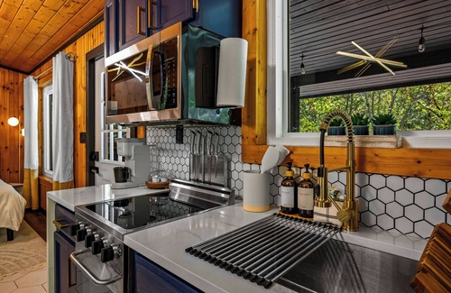 The Royal Honey is a beautiful studio cabin specifically designed for couples, featuring one bedroom and one bathroom. This cozy retreat is designed for comfort and relaxation, making it the perfect getaway. The cabin boasts a spacious yard that invites a variety of outdoor activities. Guests can unwind in the private hot tub nestled under a charming pergola, enjoy evenings gathered around the 2-person fire pit, or indulge in cinematic experiences in your very on personal theater room. (All these amenities are for your exclusive use, NOT a shared space.)