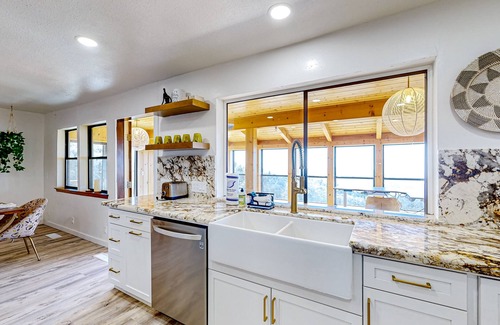 Upon entering this updated home, you will encounter a spacious living area with boho chic decor, cathedral ceilings, exposed wood beams, and plenty of windows flooding the space with natural light. Spread out comfortably on the large sectional and stream favorite shows and movies on the smart TV. Sliding glass doors lead you straight to the extensive wrap-around deck, which offers an unbeatable spot for taking in the incredible views of the mountains, city lights, and sunsets every night. This is a great spot for summertime barbecues as well - you will find a convenient grill and an outdoor dining area. There is also a hammock available that would be great for reading favorite novels with magnificent vistas.