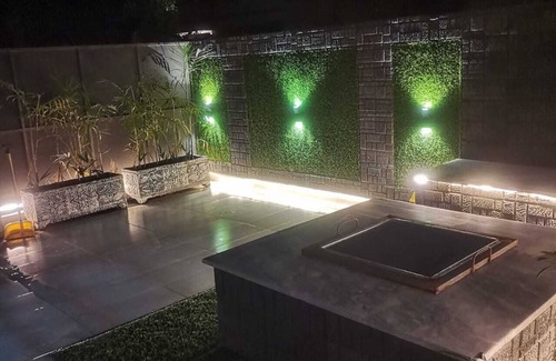 Private Back Area featuring lush palm bamboo, a serene green space, and a BBQ area — perfect for relaxing evenings