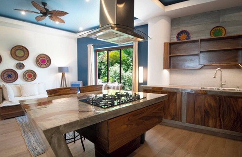 Villa Whale (Villa 2) offers 1,453 square feet of living space and is located on the top floor of the resort and features a west-facing retractable glass wall that gives you unobstructed views of the Ocean and Isla del Coral. There are two luxurious bedrooms and a full chef-style kitchen, where you can prepare delicious gourmet meals yourself or hire our chef to prepare your meals for you.