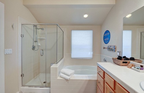 Unwind in the evening in front of the fireplace or on the back deck in your own hot tub. This beautifully furnished home was just purchased and has all new decor. The main room has vaulted ceilings, leather couches, and a 70" tv. The third bedroom has two queen beds and is very spacious, allowing kids to spread out in their own area. There is also an additional den with a queen sofa bed and large screen tv with Xbox downstairs (for streaming and games).