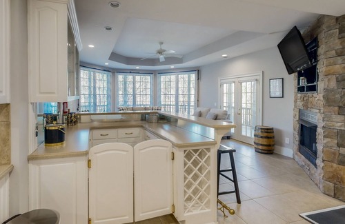 Escape to Baumhaus, a luxurious treehouse retreat nestled in the serene wooded beauty of Innsbruck’s gated golf community in Helen, GA. This stunning multi-level home is designed for both relaxation and adventure, offering a perfect blend of modern luxury and natural tranquility. With three spacious bedrooms and five bathrooms, Baumhaus accommodates families and groups with ease, ensuring everyone has their own space to unwind.