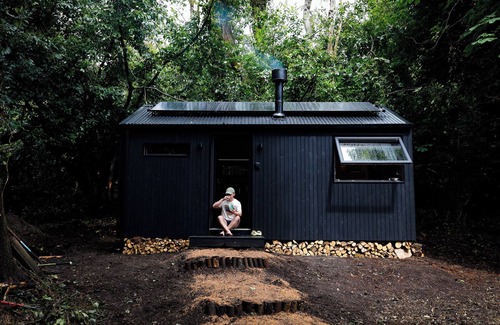 Sitting on 300 acres of woodlands, meadows and a lake, the cabin is nestled into the edge of a laurel wood. Enjoy showers looking out over a chestnut tree, cook over fire outdoors, or get cosy reading books next to the stove.
