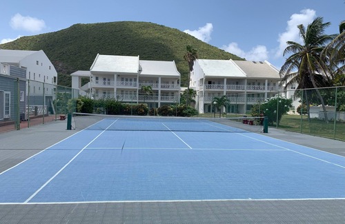The condo sits within an elegant private residence that boasts a swimming pool with a small chill-out pool, nestled within an elegantly landscaped garden, complete with a cozy seating area. There is a tennis court too. The grounds offer a relaxing, private oasis where you can unwind and soak in the Caribbean atmosphere. There is even a shaded area, ideal for morning coffee or evening cocktails.