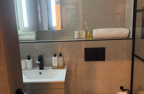 The bedroom features a plush double bed, soft linens, and plenty of storage space. The bathroom is sleek, spotless, and equipped with fresh towels and toiletries for your convenience.