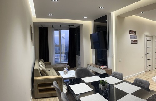 This luxury apartment has a good view and is on the 14th floor. Its style is modern-like and has 2 bedrooms and 1 bathroom. It also has a large living room. The building was recently built and is new. The location of the apartment is at the center of Dushanbe. There is also a playground by the building where kid’s could play. There’s a lot of parks around that location. Park Rudaki is a 6 minute walk.