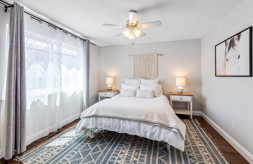 The primary bedroom has a king size bed with a dresser, and tons of closet space. The ensuite bathroom has a jacuzzi tub/shower. The other two bedrooms have queen size beds and a dedicated work space. They share a full size bathroom with a stand up shower. All rooms have custom curtains with sheer and black out curtains as well as ceiling fans.