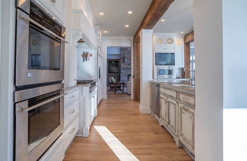 Walk in through the rocking chair front porch to a large two-story open family room, complete with a gas fireplace, custom stonework, and TV streaming all your favorites through Netflix, Hulu, HBO Max, Prime Video, and Direct Stream. Plenty of space for the entire family to gather around the enormous island or handcrafted built-in table to enjoy breakfast together. For the chef in the family, this kitchen won’t disappoint from the double oven to the oversized 6 burner gas range and pot filler, the kitchen is stocked with everything you will need! For a more formal dinner, there is a separate dining table directly off the kitchen to seat 6 comfortably. And when you need a break from it all, the sunroom is perfect to enjoy a good book and a cup of coffee. Also on the main floor is a bedroom with a queen-size bed and a full bathroom in the hallway with a shower.