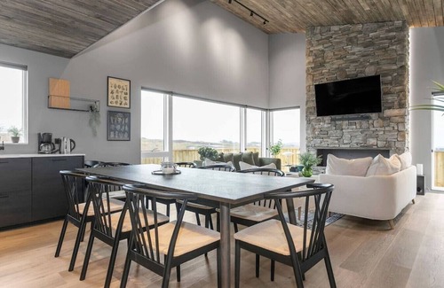 Experience the rustic charm and modern comfort in our beautiful cabin nestled in the heart of nature. With four cozy bedrooms, a fully equipped kitchen, and a spacious living room with an electric fireplace, this cabin is the perfect retreat for a romantic getaway or a family vacation. Relax in the hot tub terrace with panoramic views of Icelandic nature, or explore nearby attractions. Unwind and reconnect with nature at our lovely cabin.