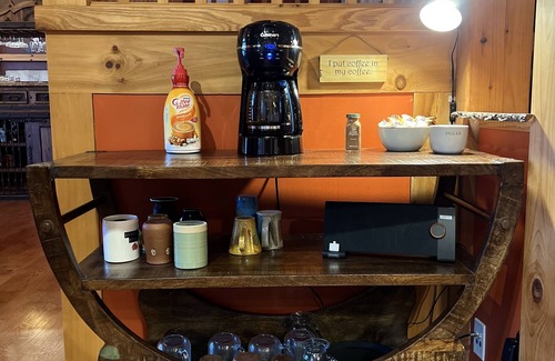 The gourmet kitchen has amazing views with a wall of windows. It’s stocked with everything you could need. Dishwasher, oven/stove, microwave, toaster, blender, pots/pans & a coffee bar (with real coffee maker, not keurig) to start your mornings off right! The Lodge also has every type of bar glassware you could want, so toast away! We even have kids' plates & utensils, so you don't need to bring a thing. The dining table is in the kitchen & the window nook is a favorite spot for all!