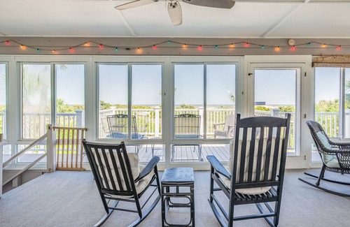 A: It’s oceanfront, stylish, and surprisingly spacious. You’ll have six bedrooms across two levels, beach chairs and a cart ready to go, and a wraparound porch overlooking the water — all designed for families who want both comfort and coastal charm.