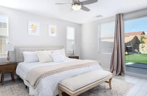 Modern newbuild luxury home! This 4-bed, 3-bath modern oasis features a pool, hot tub, sunken fire pit, attached casita, outdoor BBQ, putting green, and cornhole. Perfect for relaxation and family fun. Book now!