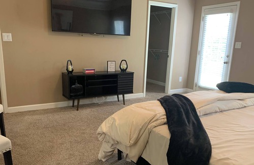 Welcome to the West Park Retreat! Visiting family, on temporary work assignment, in town for holidays, or graduation? Stay in a quiet location only 20 minutes from Ft. Liberty (Bragg), hospital, dining, and shopping. The West Park Retreat is a large two-bedroom, two-bathroom townhome that sleeps four guests comfortably, with a full kitchen, a large open-concept living area, and an attached garage. Cameras surround the property for a safe, secure stay and keyless entry. Kick back and relax in this calm, private, & stylish space.