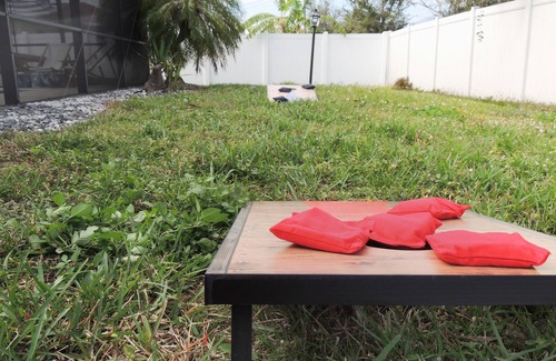 The backyard is a south Florida oasis, with a heated pool ($75 per stay). There is a sofa, and foldable chairs available for guests to use. This area is perfect to cool down in the Florida sun, unwind while reading a book or enjoy an evening cocktail by the pool. There is a propane grill ideal for a barbecue lunch, and games such as four-in-a-row and giant jenga available for guests in the backyard.