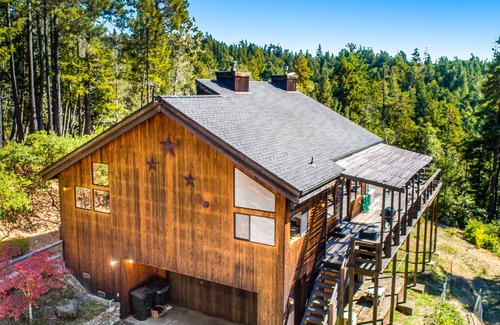 Book a vacation to remember at this dreamy North Coast getaway. Set on 11 very private acres, this two-bedroom retreat offers a magical escape surrounded by the sights and sounds of nature. The property is situated on a ridge above the fog line, creating a unique micro climate with warmer average temperatures than at sea level. Unobstructed sky views offer unforgettable sunset vistas. Make the most of your serene surroundings out on the expansive deck furnished for comfortable outdoor living with a private hot tub, grill, and lounge and dining areas.
