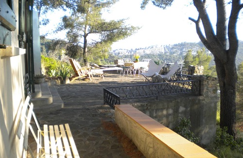 A detached cottage unseen by others in the secluded hills beyond the old and elegant seaside town and working fishing port of Bandol, located on approximately four acres of terraced slopes on a hilltop with a spectacular view of the Bay of La Ciotat, 'Port Vignoble' is beautifully restored, furnished and equipped, sleeping, ideally, anything from a couple to a family of four. It is centrally air conditioned and heated. Hidden by our pine woods off the country road that runs from Bandol to the ancient village, French doors open onto the large terrace in the front onto an aerial view of the Mediterranean across vineyards descending to the sea. We have two bedrooms, shower room, large kitchen-dining room, sitting room and laundry room. Newly centrally air-conditioned and heated.