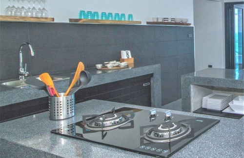 With direct access from the car park, the living room is the main living room, with a dining area, a lounge, the kitchen. It opens onto the terrace with its large infinity pool. The terrace is equipped with sun loungers, beans bags and a barbecue.
