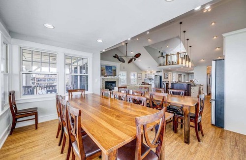 Step outside to a private pool deck designed for groups to gather. Two hot tubs, a sauna, shaded seating areas, picnic tables, and a grilling station offer plenty of options for lounging and dining al fresco. A private boardwalk leads over the dunes to the beach, and an upper viewing deck makes a quiet place to catch the sunrise or stargaze after dinner.