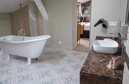 - Isabelle Adjani room (31 m²): a queen-size bed (160×200) with an adjoining bathroom with bathtub and WC.