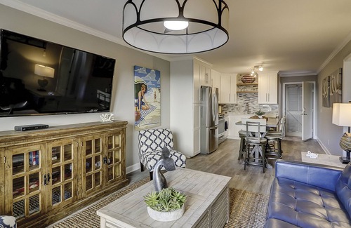2 bedroom, 2 bath, naturally lit open floor plan sleeps 6 comfortably. 1st floor location means no waiting for elevator. Kitchen has quartz countertops, new high end stainless appliances, counter height table and chairs, coffee center with Keurig and drip coffee maker. Villa is fully stocked with all new furnishings, one of the few units with in unit washer/dryer (additional laundry on each floor). Living area and both bedrooms have smart TV’s for streaming. Villa has high speed internet and cable. Charming patio with views of the ocean with access from living room and master suite. Master suite has king bed and bath with walk-in shower. 2nd bedroom has extra long twin over queen bunk and separate bath. Hop on the free Breeze Trolley outside the complex gate. Located on the bike path and a bike rack is on the property.