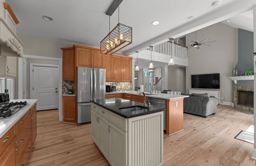 The main level features an open-concept living room, dining room, and kitchen. All rooms are easily accessible from one another. The kitchen is fully stocked for the chef of your party to prep meals for the whole group; in the morning, coffee is readily available from the drip coffee maker or the Keurig. The kitchen offers an eat-in area with a table for four and counter seats for three. The living room has a cozy sectional to enjoy views of the deck or watch a show on the TV, complete with lake views! The modern dining room features a large glass table seating 8 with a new chandelier. There is a quiet study off the kitchen with a sofa and TV for the early risers to watch while not disturbing the rest of the group. This room offers a queen sleeper sofa as well. The primary bedroom is on the main level with a king bed, attached bath with soaking tub, separate walk-in shower, and dual vanities.