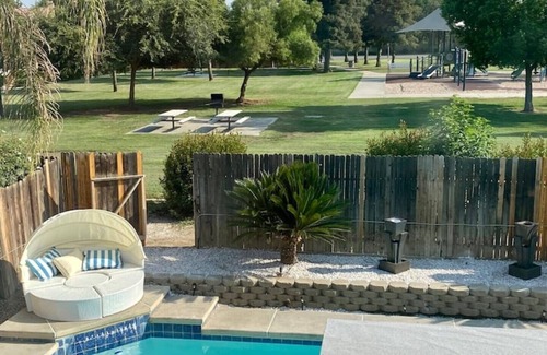 pool Four bedroom three bathroom home recently renovated outdoor patio by the pool perfect for barbecue with the family or friends you have access to the entire house and also there is a back door by the pool where you could enter the park located right next-door for any events in the park must check in with the city of Bakersfield for information You also have washer and dryer available to you at no cost