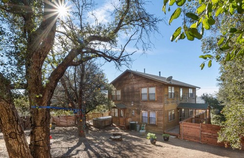 Cabin vibes with elegance. Bring the family over to make lasting memories in a home tucked away in the hills of Julian. You won’t have to look long to find wild turkeys, deer, blue jays, and quail passing by. The home has many unique features, including a family game room with a reversible poker/bumper table, arcade games and foosball. One bedroom is actually a separate studio suite with a private full bathroom and kitchenette. Guests have access to a gated backyard with various play equipment.