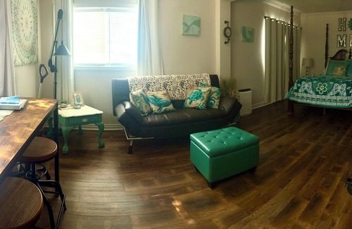 This rental is on ground level and has a single step private entry, making it more accessible. It has been renovated, but we kept some of the historic charm. The size is approximately the same as a standard hotel room, but we provided a lot more amenities and a LOT more affordable. It is a studio style with queen super comfy bed, closet, full kitchen, bathroom with walk-in shower and a seating/sleeping area. Sofa folds down to full size bed. Add the memory foam topper from the closet for maximum comfort. There are blinds and blackout curtains to help you get a restful nights sleep. This apartment is in a building housing 7 units, so quiet hours are a must. Tv is streaming with free WIFI boasting highest speed available with unlimited data. Outside area has gazebo seating, sunny seating and outdoor table. Charcoal grill provided.