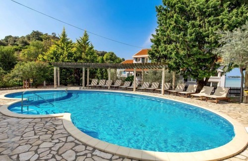 Kampor, 6 km from Rab: Child friendly apartment block. In a quiet, sunny position, 10 m from the sea, 10 m from the beach. For shared use: property (fenced), well-kept garden with lawn, swimming pool kidney-shaped heated (12 x 6 m, depth 120 - 160 cm, seasonal availability: 25.Apr. - 03.Oct.) with internal staircase. Children's pool, outdoor shower, arbour, garden furniture, barbecue. In the house: internet access. Parking on the premises. Shop, restaurant 150 m, bus stop 2.4 km, concrete beach 10 m. Please note: the photograph shows a typical example. Additional accommodations can be booked. Property ref. HR3703.631 is situated on the same property. The apartment house "Mare" is situated on the same grounds (2700 m2) with the apartment house "Tomislav", with swimming pool for shared use with counterflow. One part of the pool is a paddling pool, depth 30 - 60 cm. Deck chairs at disposal. In front of the house concrete beach with sand sea bottom, slightly sloping, very suitable for children.