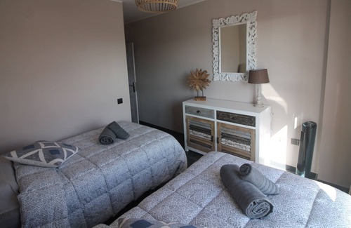 Recently refurbished to a very high standard, this spacious and bright Penthouse apartment has 3 bedrooms directly on the first lagoon beach in El Cotillo. Large dual aspect and very private roof terrace with stunning views to both the lagoon beaches and to the village of El Cotillo. The property has an en suite primary bedroom with stunning sea views, another double bedroom and twin bedded room both facing the village and both with partial sea views, and a separate family bathroom. The open plan living area has floor to ceiling windows offering panoramic views of the lagoons. This area has a fully equipped kitchen with brand new high spec appliances and a dining table and seating for 6 people, and lounge with a comfortable sofa and 2 arm chairs. On the roof terrace, accessed from within the apartment, there are lots of comfortable and stylish seating options and a large dining table and chairs for 6 people and 4 sun loungers. Downstairs is the large shared swimming pool (not heated). There is also a smaller children´s pool. Surrounding the pool is a large sunbathing area with supplied sun loungers and attractive gardens with gates leading directly onto the beach.