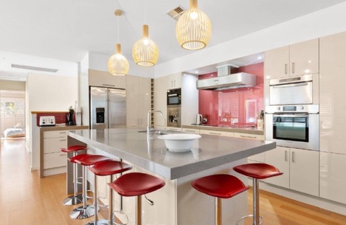 * Gourmet kitchen with electric cooking, steamer, microwave, dishwasher; island bench, built in ground coffee machine and pod machine