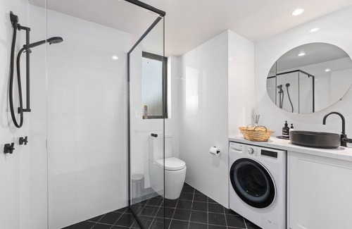 Newly renovated bathroom with washer/dryer combo laundry facilities in bathroom