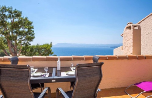 2-room apartment 31 m2, on the upper ground floor. Comfortable and modern furnishings: living/dining room with 1 double sofabed (140 cm, length 190 cm). Exit to the terrace. 1 room with 1 french bed (160 cm, length 200 cm), TV (flat screen). Kitchenette (2 induction hot plates, electric coffee machine, Capsules for coffee machine (senséo) extra, combination microwave). Shower/WC. Air-conditioning, forced-air heating. Terrace 19 m2, west facing position. Terrace furniture. Very beautiful view of the sea. Facilities: washing machine, iron. Internet (WiFi, extra). Parking space n 66. Please note: parking space for small car only. TV only FR. Smoke alarm. 83112 000243 FM
