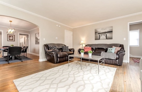 Our house was just renovated throughout! The two-story house is a large 6 bedroom/2 full bath with 2 full kitchens. Updated kitchens, bathrooms, and bedrooms with brand new memory foam mattresses. This house is perfect for groups of friends, families, or co-workers! Our house is just 1/2 mile from OSU, Expo Center, and Mapfre Stadium. We are just 5-10 minutes from the Short North and Convention Center as well. We have off-street parking for 6 cars and are just 10 minutes from the airport! This is a very large two-story home. We have 10 true beds within the bedrooms and an additional 7 beds between the pull-out sofa, couch, and air mattresses. The first floor has 2 large bedrooms, 1 full updated bathroom, updated kitchen w/ stainless appliances, large living room, & dining room. The second floor has large 4 bedrooms, 1 full updated bathroom, and a second updated kitchen w/ stainless appliances. The living room has a three couches. Two couches with reclining seats and a pull-out sofa. Plenty of seating for large groups! The dining room table is very large - 6 chairs w/ additional chairs provided. All bedrooms have brand new memory foam mattresses! There is off-street parking for 6 cars and free street parking in front of the house. There is a front patio w/ wicker chairs and yard as well. There is a washer and dryer for your convenience. You are able to access the entire place. We are hands-off hosts but are available as needed! The home is located near Iuka Ravine off of N. 4th St. There is a mix of musicians, professors, students, and working professionals who live in the area. The house is centrally located to all Columbus has to offer. The house is within walking distance (15 mins or so) to Ohio State University. We are just around the corner from the Ohio Expo Center and Mapfre Stadium. We are 5-10 minutes from all of the action in the Short North, Convention Center, Nationwide Arena, and Downtown. We are located close to all major highways and 10 minutes from the airport. We have off-street parking for 6 cars. We also have free street parking just outside the home. There are bus stops on 4th St. and it is a very cheap Uber to all of the best Columbus has to offer. We have a strict no party policy. While our house is able to host large groups, we expect you to treat this home respectfully and obey all house rules. Thank you in advance! Other things to note We have a strict no party policy. While our house is able to host large groups, we expect you to treat this home respectfully and obey all house rules. Thank you in advance! House rules Our street is a very quiet street that is full of owner occupants and long term tenants. This is not an area where loud noise is acceptable or tolerated by the residents. We have a strict noise restriction inside and outside of the listing after 10 pm. Any violation of this is cause for the reservation to be cancelled with no refund and additional charges for any damages done to the home. Outside Guest/Party Policy We have a strict zero tolerance policy regarding outside guests and parties in the home. Only the number of guests listed on the reservation to be at the home at all time unless we give prior consent. Any violation of this is cause for the reservation to be cancelled with no refund and additional charges for any damages done to the home. Smoking Policy We have a strict zero toleance policy regarding smoking of any kind (marijuana/hookah included) inside the home. Any violation of this is cause for the reservation to be cancelled with no refund, a $500 fine, and additional charges for any damages done to the home. Weapons/Drugs/Drinking Policy No weapons or drugs of any kind will be permitted in or around this home. Only those of legal drinking age (21 years of age or older), may be permitted to possess or drink alcoholic beverages in or around this home.