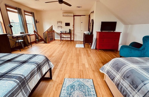 The Master Suite is located on the second floor of the Honeycomb. The spacious floorpan offers two queen beds, two dressers and a working space with a desk and beautiful green view. The bathroom is en suite.